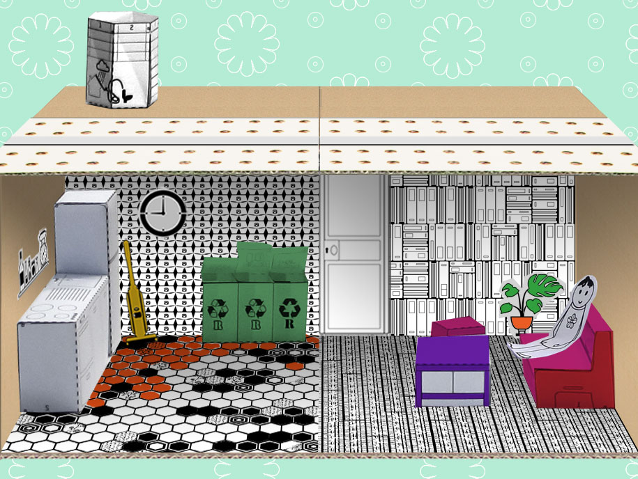 Pour construire la maison écologique +Mieux, se munir d’une paire de ciseau et de colle (ou adhésif ou agrafeuse) pour assembler les patrons papier des meubles et des figurines. L’usage d’un cutter sous la surveillance d’un adulte permet de créer des ouvertures dans les parois de la maison en suivant les dessins des fenêtres et portes des stickers.