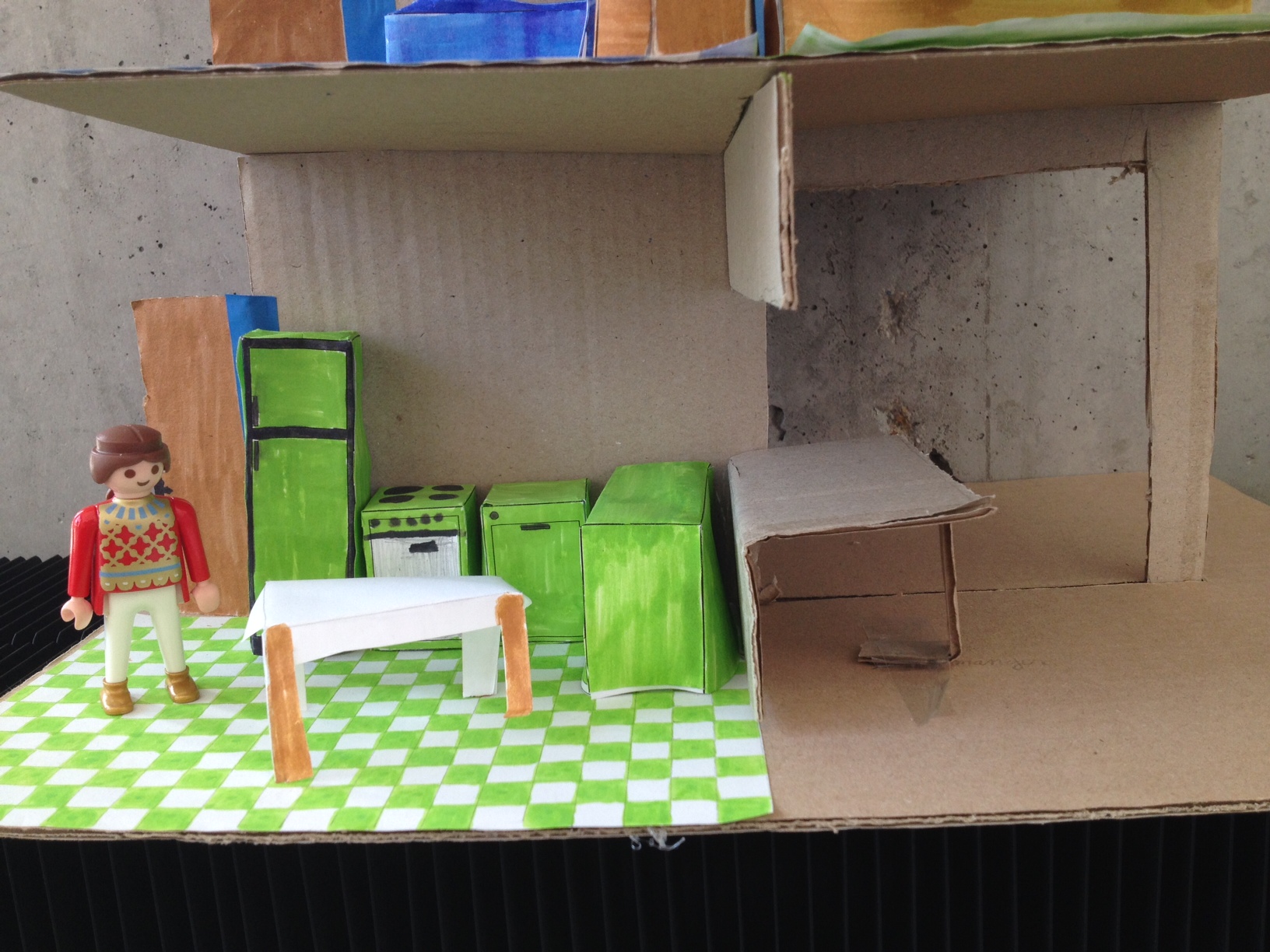 Création Apolline : une cuisine verte avec table rabatable vers le salon