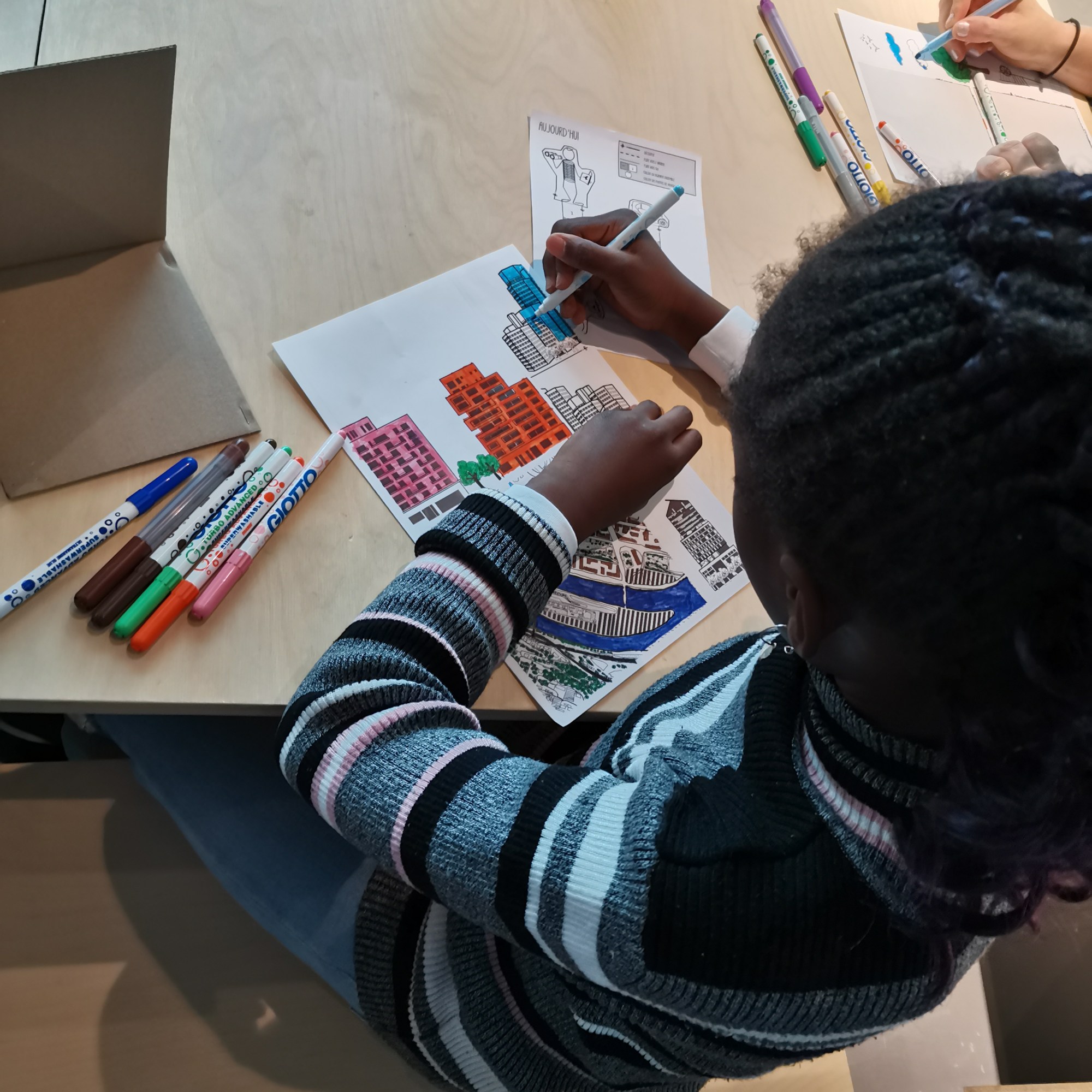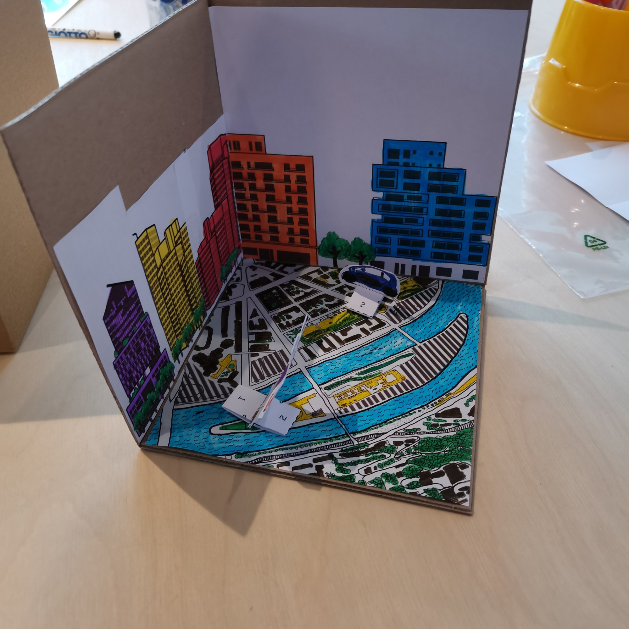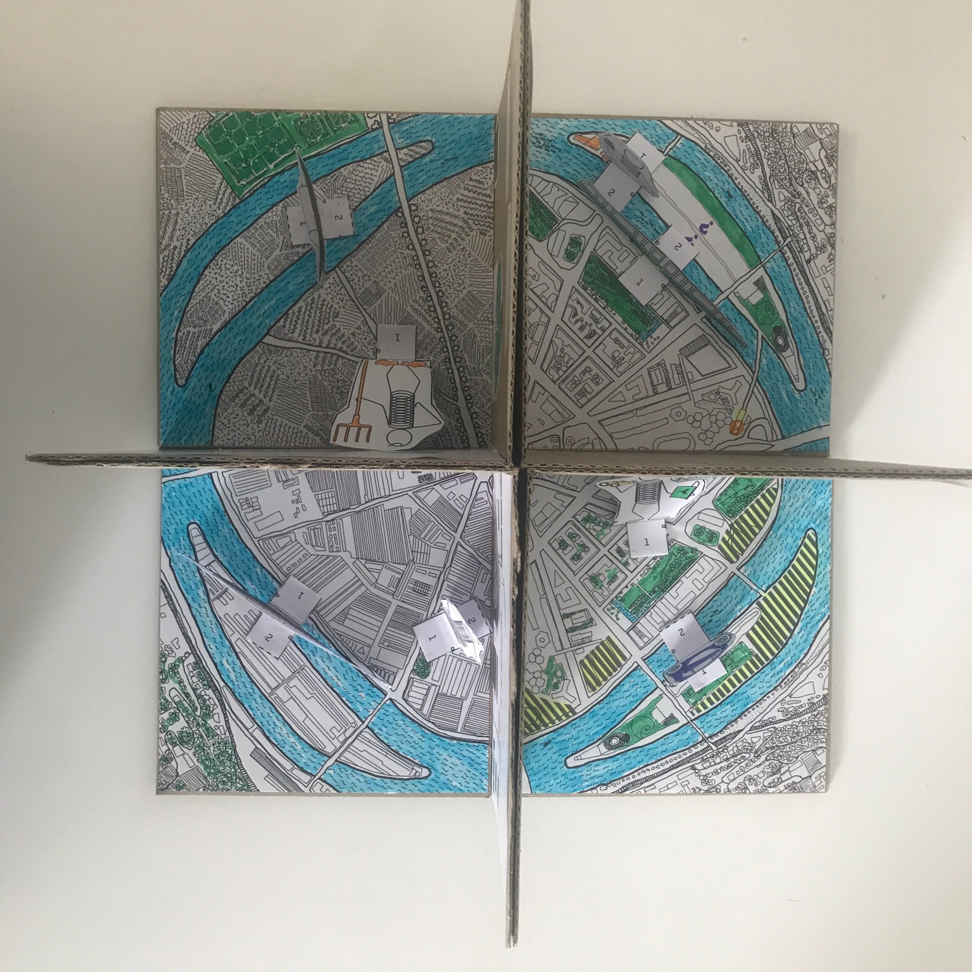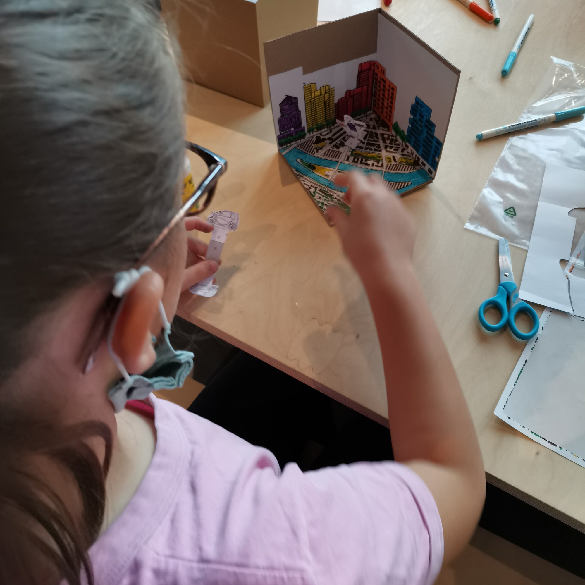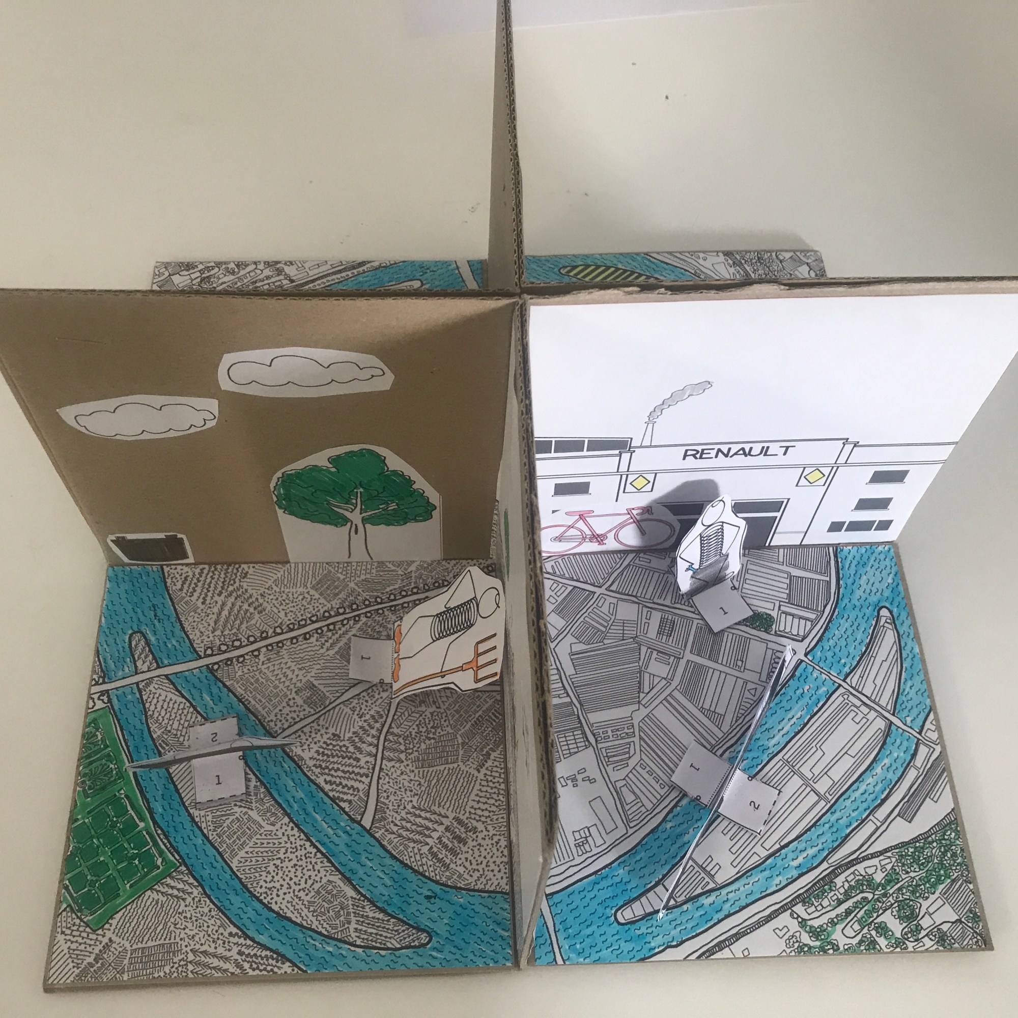En coupant, collant, coloriant des éléments en papiers et carton, ils donnent vie à de petites saynètes présentant le quartier en 4 étapes :
