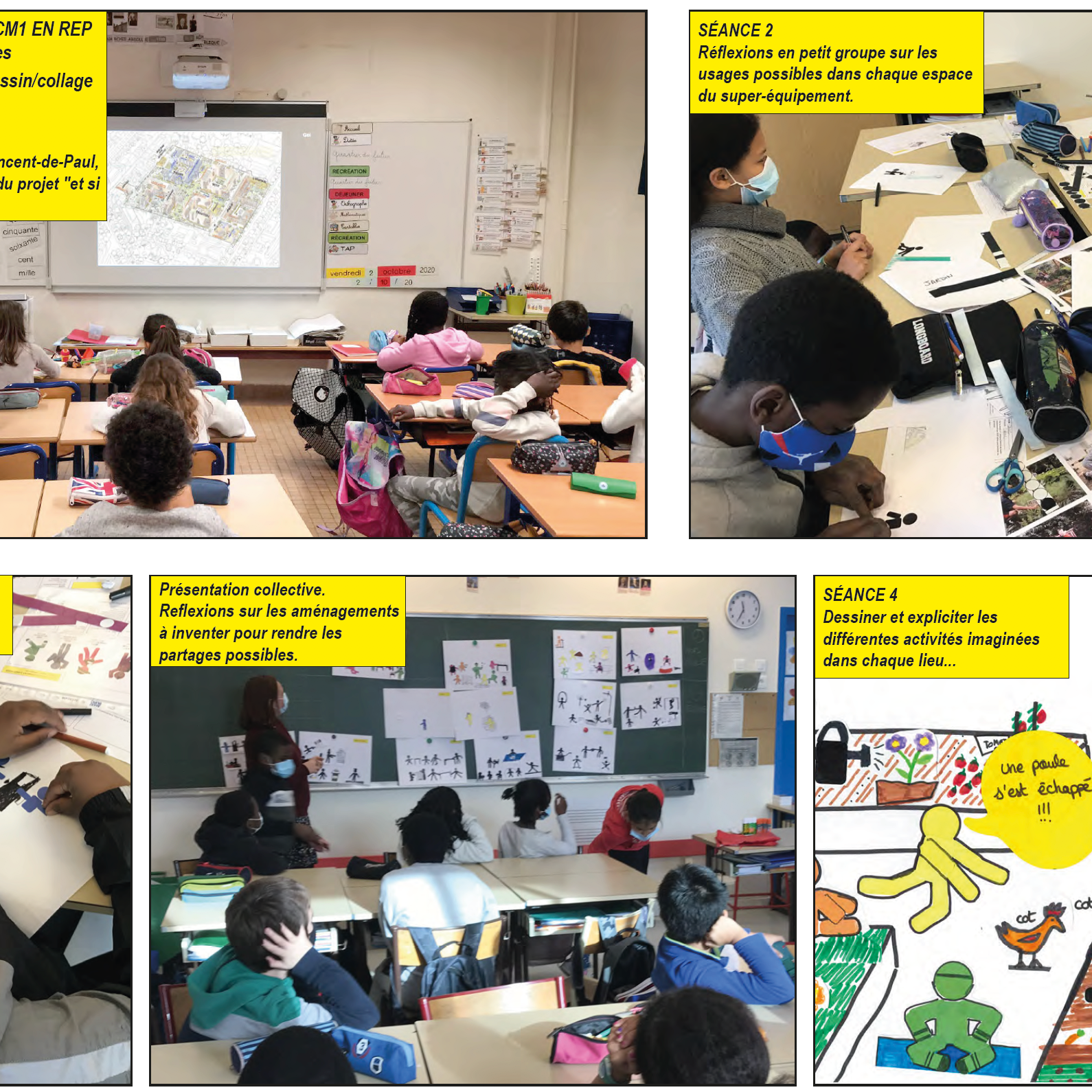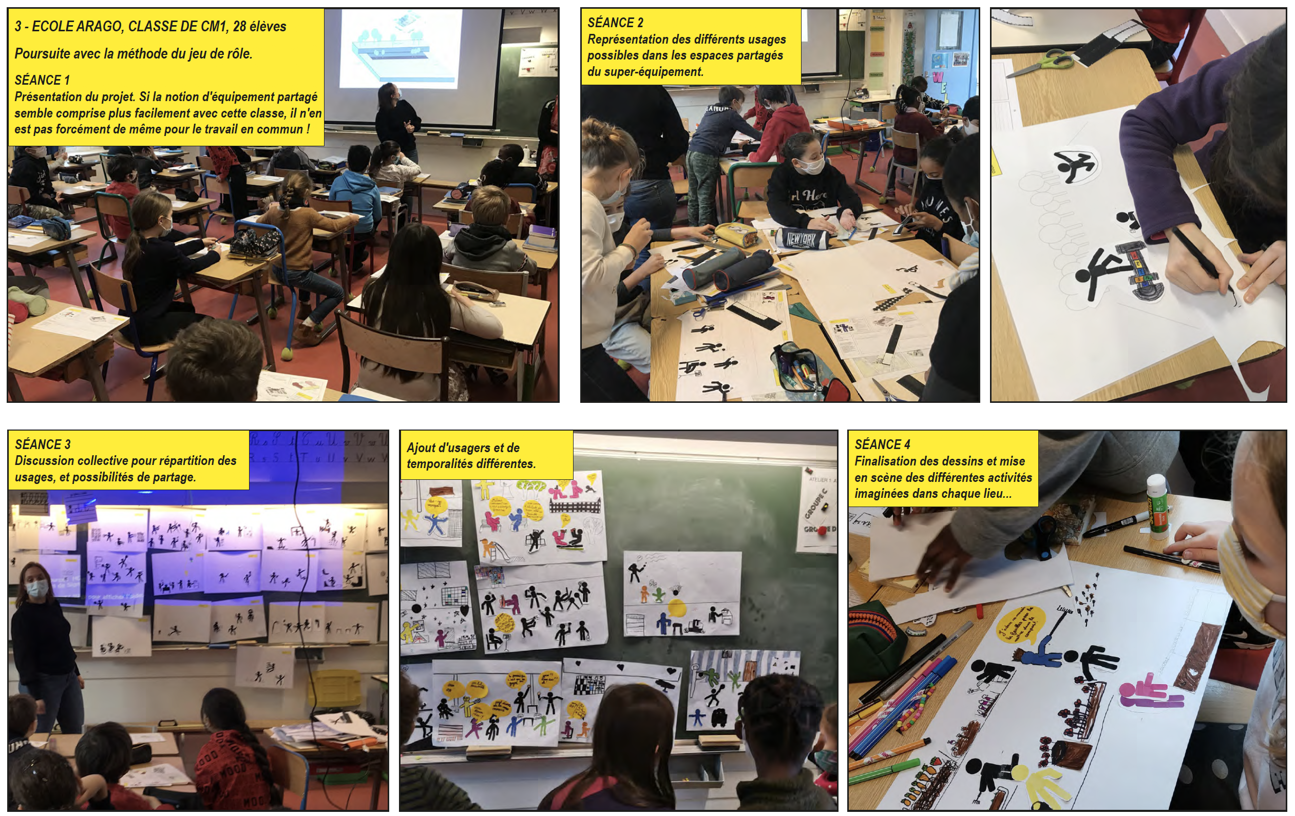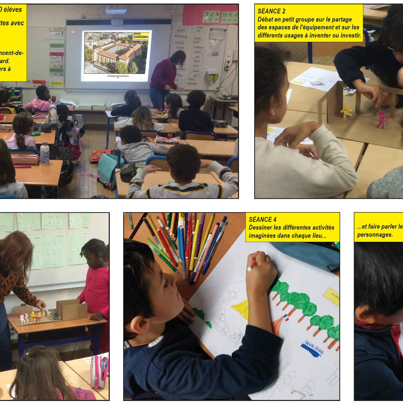 Le parcours de quatre ateliers, conçu par +Mieux création se partage entre temps de présentation des projets urbains et architecturaux et de leurs enjeux, temps d’échanges et de débats sur les pratiques et usages à inventer, et temps de création et d’expression graphique. Après avoir découvert les points forts du projet urbain (mixité des fonctions urbaines, priorité aux circulations douces, réemploi, empreinte carbone réduite…), les enfants, aidés des supports et outils +Mieux, mobilisent leur expertise d’usagers des équipements scolaires pour expliciter leurs pratiques actuelles et rêvées et se projeter dans la conception collaborative d’un équipement mutualiste ; quelles activités et quel partage de la cour de récréation ? quels espaces peuvent s’ouvrir hors des temps d’occupation scolaire et pour quels usages ? quelles activités imaginer dans les espaces communs à la crèche, au gymnase et à l’école ? comment tout au long de l’année cultiver et profiter des jardins pédagogiques ?… Les enfants illustrent leur proposition sur ces différentes thématiques en réalisant des collages de dessins et textes qui composent, à l’issue des quatre séances, une petite histoire racontant leur vision d’un nouveau mode d’habiter une école partagée et ouverte sur le quartier.