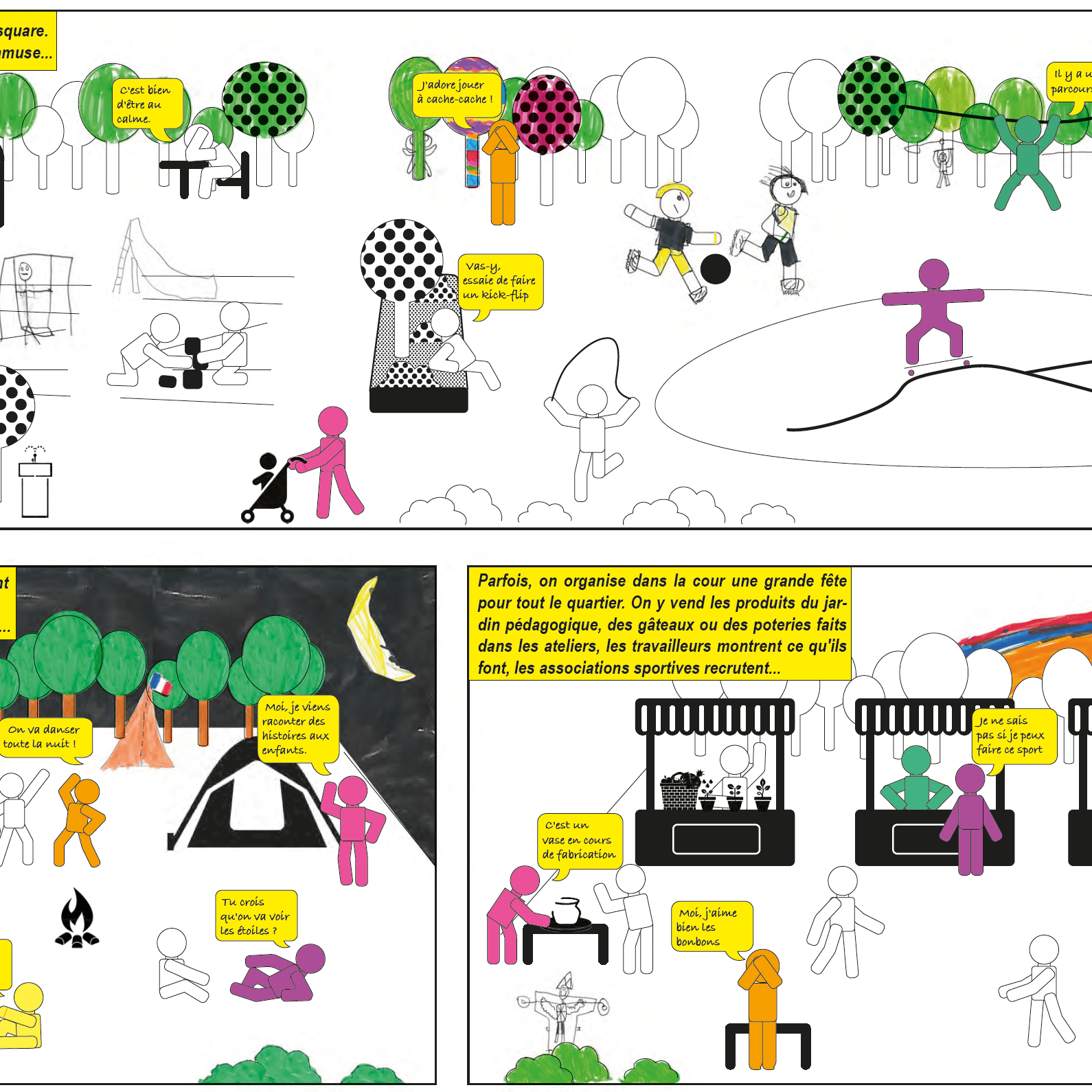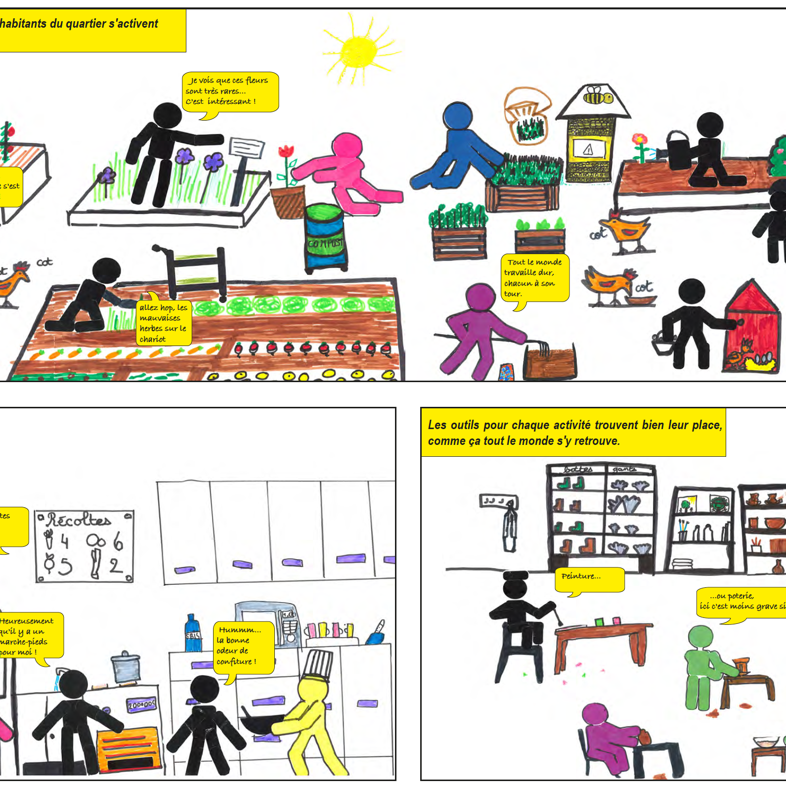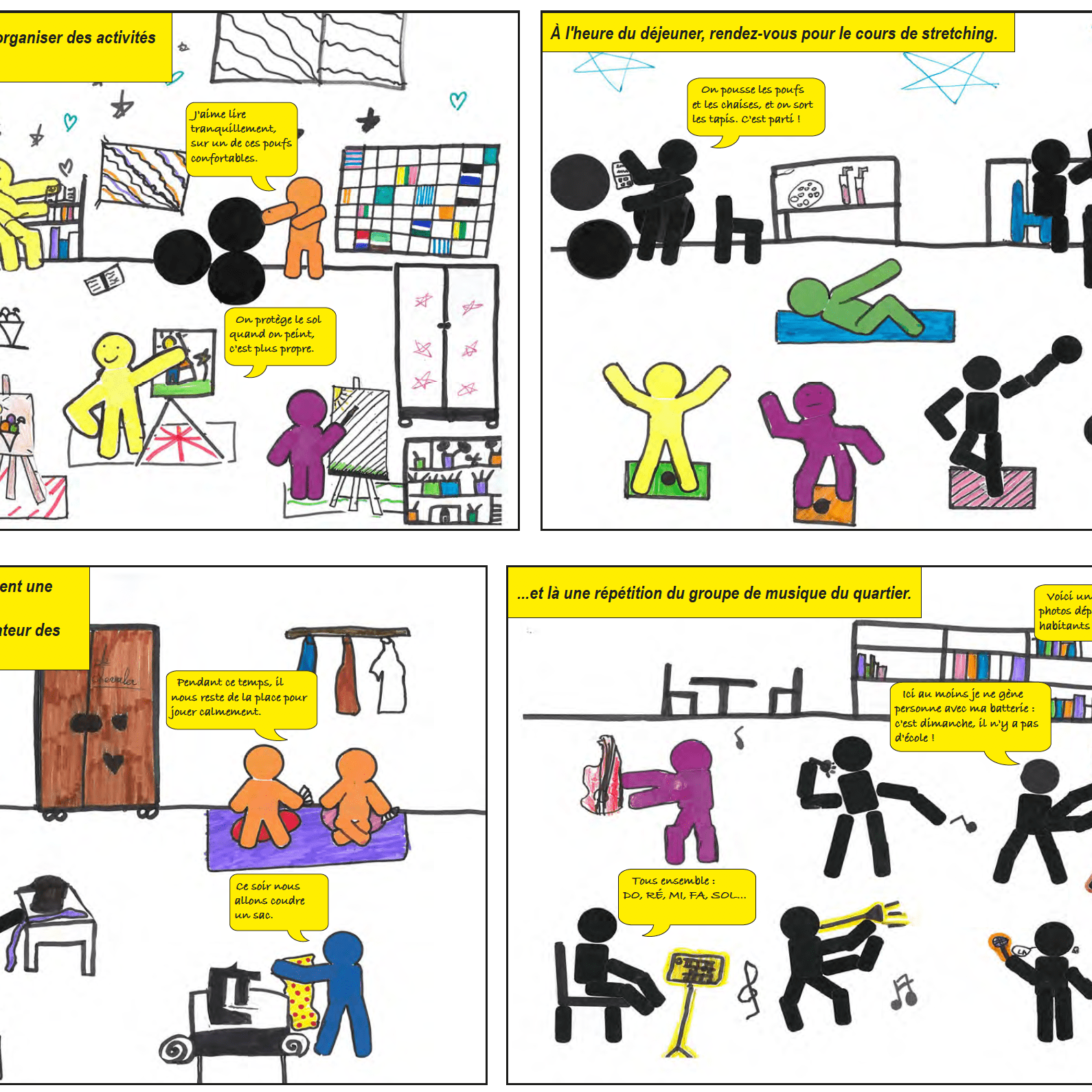 Le parcours de quatre ateliers, conçu par +Mieux création se partage entre temps de présentation des projets urbains et architecturaux et de leurs enjeux, temps d’échanges et de débats sur les pratiques et usages à inventer, et temps de création et d’expression graphique. Après avoir découvert les points forts du projet urbain (mixité des fonctions urbaines, priorité aux circulations douces, réemploi, empreinte carbone réduite…), les enfants, aidés des supports et outils +Mieux, mobilisent leur expertise d’usagers des équipements scolaires pour expliciter leurs pratiques actuelles et rêvées et se projeter dans la conception collaborative d’un équipement mutualiste ; quelles activités et quel partage de la cour de récréation ? quels espaces peuvent s’ouvrir hors des temps d’occupation scolaire et pour quels usages ? quelles activités imaginer dans les espaces communs à la crèche, au gymnase et à l’école ? comment tout au long de l’année cultiver et profiter des jardins pédagogiques ?… Les enfants illustrent leur proposition sur ces différentes thématiques en réalisant des collages de dessins et textes qui composent, à l’issue des quatre séances, une petite histoire racontant leur vision d’un nouveau mode d’habiter une école partagée et ouverte sur le quartier.
