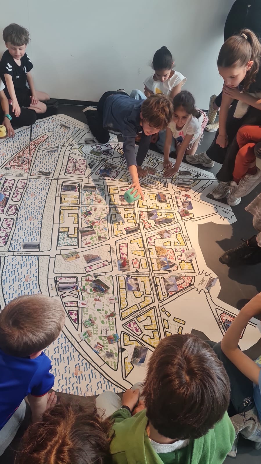 Au cours des mois de mars et mai 2025, +Mieux création a accompagné 4 classes du CP au CE2 pour réaliser un jeu de plateau géant sur le quartier Ile Seguin – Rives de Seine. Après avoir découvert et approfondi leurs connaissances historiques et écologiques, les enfants ont fabriqué des motifs en tampons, et dessiné des bâtiments et des arbres pour habiter le plateau de jeu-puzzle. Ils ont également rédigé des questions permettant de faire deviner les principaux bâtiments et espaces publics du quartier. Le jeu géant a été expérimenté par les 4 classes au Pavillon des Projets, a été présenté au Maire de Boulogne-Billancourt lors d’un événement à l’école, et circule entre les classes de l’établissement pour diffuser toutes les connaissances acquises, et le plaisir du jeu !