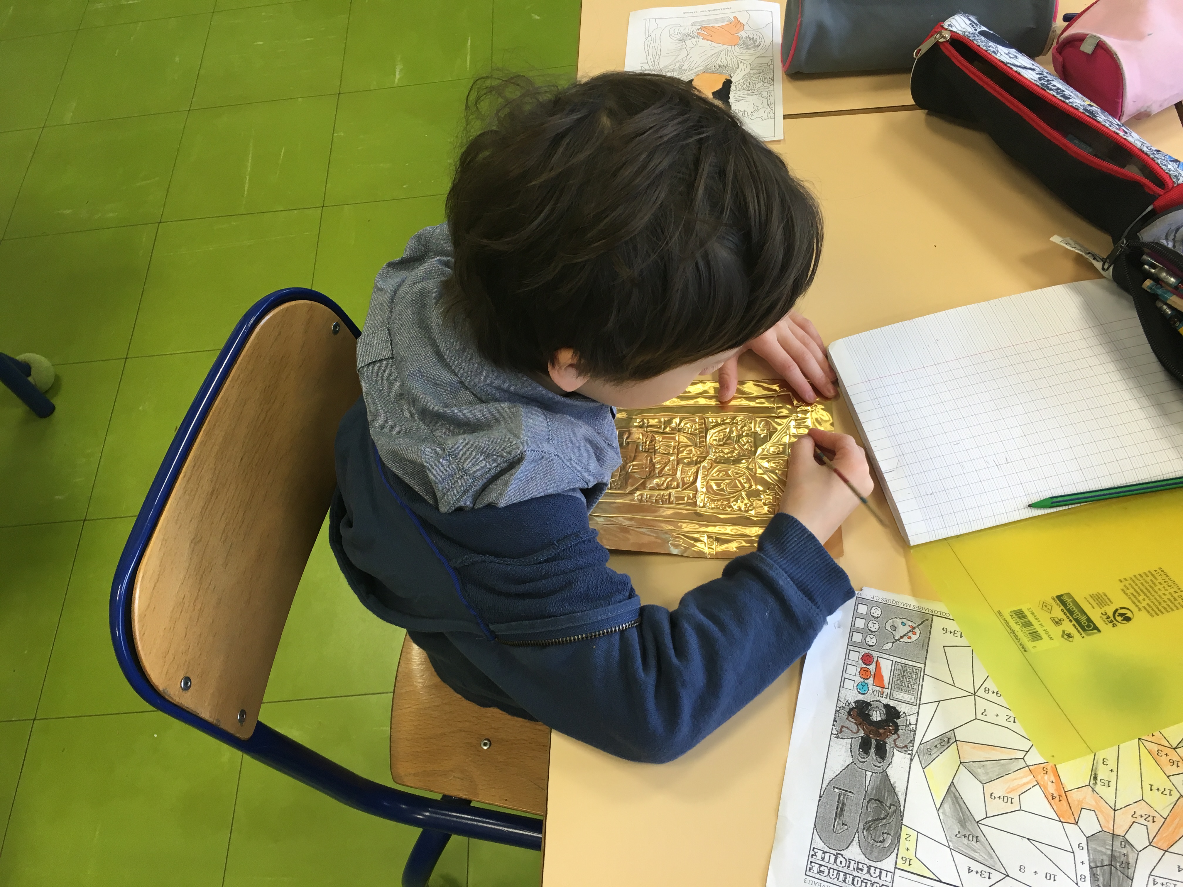 la « peau » de la licorne en métal à repousser, travaillée par une classe de CP